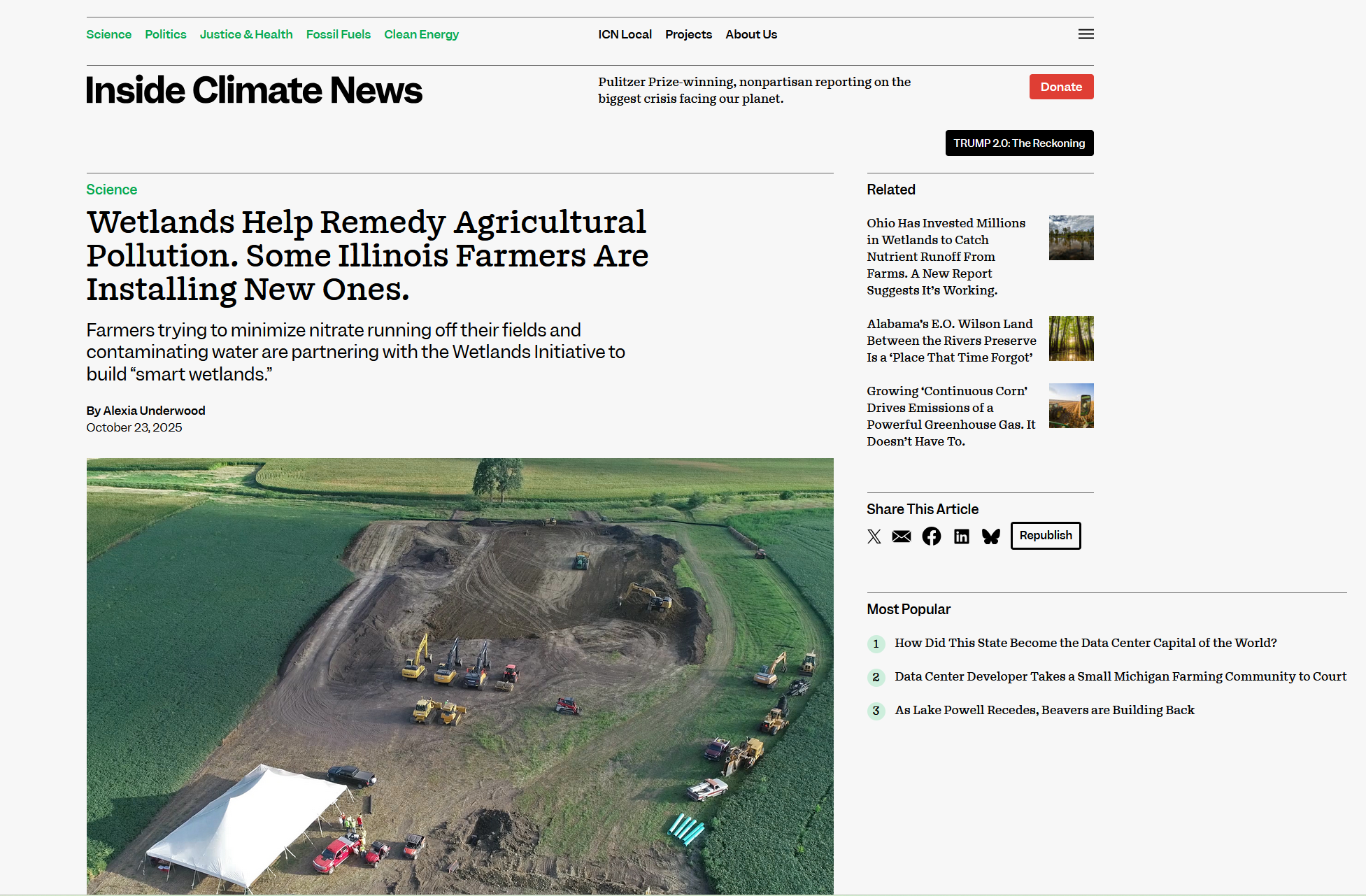 The Wetlands Initiative is pleased that our Smart Wetlands are considered A Reason to be Cheerful. The story along with photos and video from wetlands in Livingston and Marshall County, IL can be found at https://reasonstobecheerful.world/farmland-constructed-wetlands-healthier-watersheds/